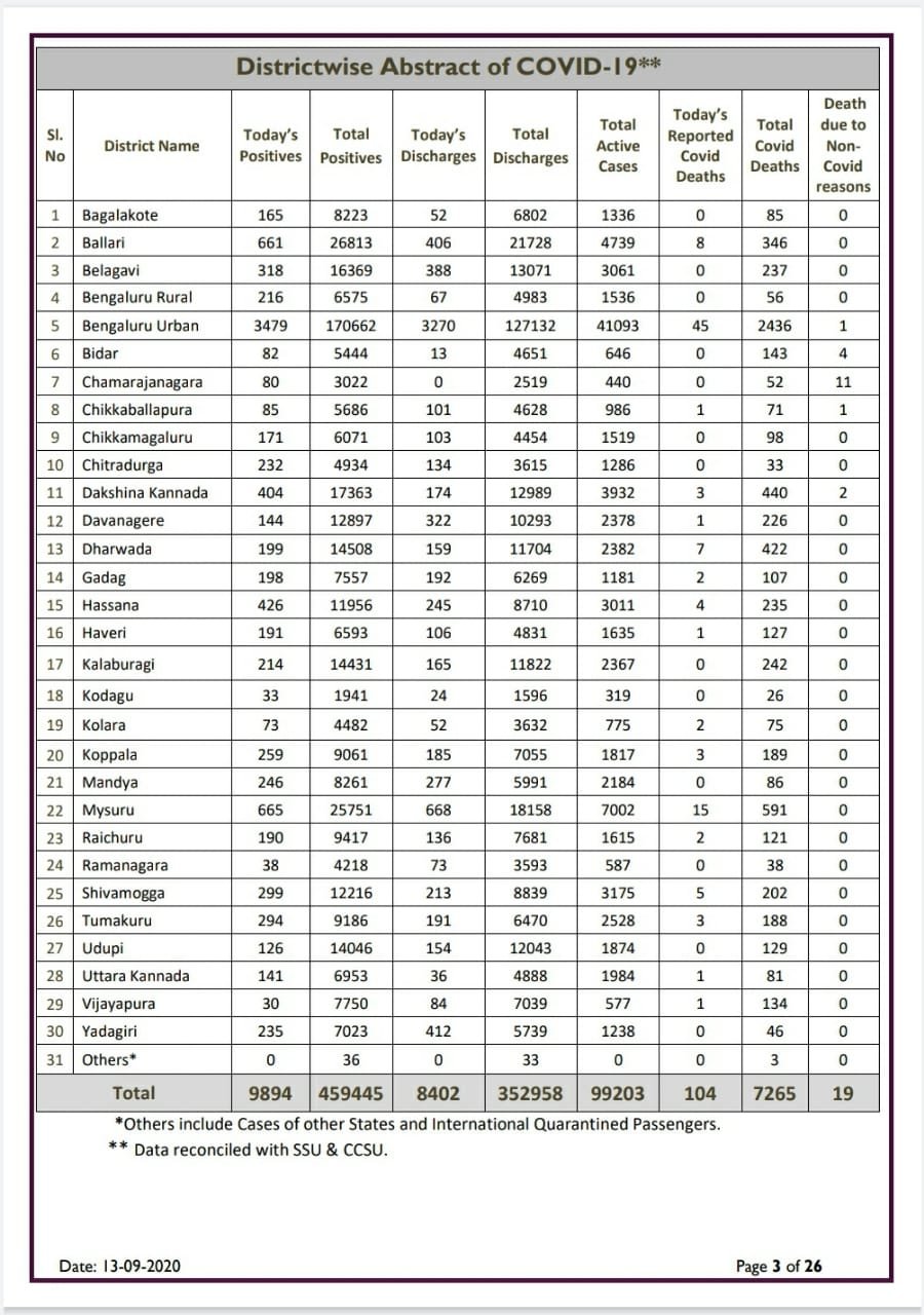 ಬೆಂಗಳೂರು,ಸೆ.13: ರಾಜ್ಯದಲ್ಲಿ ಕರೋನ ಹಾವಳಿ ಮುಂದುವರೆದಿದ್ದು, ಇಂದು 9,894 ಹೊಸ ಕೊರೋನಾ ಸೋಂಕಿತ ಪ್ರಕರಣಗಳು ಪತ್ತೆಯಾಗಿದ್ದು, ಇಂದು 104 ಜನರು ಸಾವನ್ನಪ್ಪಿದ್ದಾರೆ, ರಾಜ್ಯದಲ್ಲಿಂದು 8,402 ಜನರು ಕರೋನ ಸೋಂಕಿನಿಂದ ಗುಣಮುಖರಾಗಿದ್ದು, ಸೋಂಕಿತರ ಸಂಖ್ಯೆ 4,59,445 ಏರಿಕೆಯಾಗಿದೆ. ರಾಜ್ಯದಲ್ಲಿ ಒಟ್ಟು…