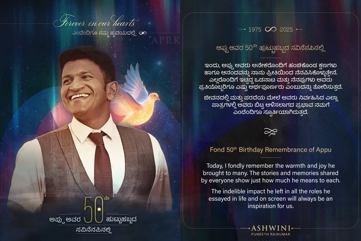 ಪುನೀತ್ ರಾಜಕುಮಾರ್ ಅವರ ಜೀವನ ಮತ್ತು ಸಾಧನೆಗಳು ಕನ್ನಡ ಚಿತ್ರರಂಗದಲ್ಲಿ ಅಮರವಾಗಿವೆ. ಅವರ 50ನೇ ಜನ್ಮದಿನದಂದು ನಡೆದ ಈ ಸಮಾರಂಭವು ಅವರ ಕುಟುಂಬ ಮತ್ತು ಅಭಿಮಾನಿಗಳಿಗೆ ಒಂದು ಭಾವನಾತ್ಮಕ ಕ್ಷಣವಾಗಿತ್ತು. ಪುನೀತ್ ಅವರ ಸ್ಮರಣೆಗಳು ಚಿರಸ್ಥಾಯಿಯಾಗಿ ಉಳಿಯುವುದರೊಂದಿಗೆ, ಅವರ ಕುಟುಂಬವು ಅವರ ಆತ್ಮಕ್ಕೆ ಶಾಂತಿ ಸಿಗಲೆಂದು ಪ್ರಾರ್ಥಿಸಿದರು.