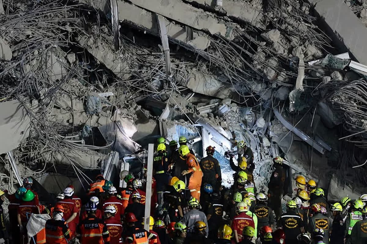 ಮಾರ್ಚ್ 29, 025 ರ ಶನಿವಾರ ಮುಂಜಾನೆ ಥೈಲ್ಯಾಂಡ್ನ ಬ್ಯಾಂಕಾಕ್ನಲ್ಲಿ 7.7 ತೀವ್ರತೆಯ ಭೂಕಂಪದ ನಂತರ ಕುಸಿದುಬಿದ್ದ ನಿರ್ಮಾಣ ಹಂತದಲ್ಲಿರುವ ಎತ್ತರದ ಕಟ್ಟಡದ ಸ್ಥಳದಲ್ಲಿ ರಕ್ಷಕರು ಕೆಲಸ ಮಾಡುತ್ತಿದ್ದಾರೆ.