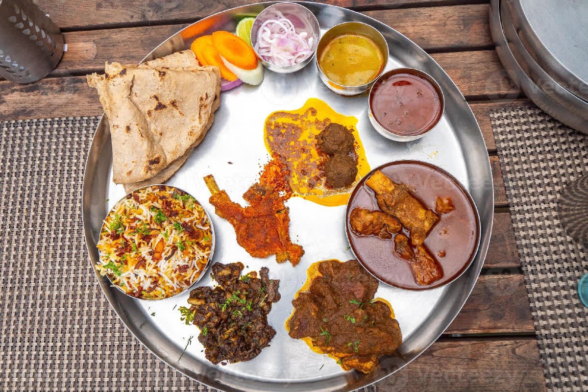 ಒಂದು ಸಸ್ಯಾಹಾರಿ ಥಾಲಿಯು ರೊಟ್ಟಿ, ತರಕಾರಿಗಳು (ಈರುಳ್ಳಿ, ಟೊಮೆಟೊ ಮತ್ತು ಆಲೂಗಡ್ಡೆ) ಅಕ್ಕಿ, ಬೇಳೆ, ಮೊಸರು ಮತ್ತು ಸಲಾಡ್ಗಳನ್ನು ಒಳಗೊಂಡಿರುತ್ತದೆ. ಮಾಂಸಾಹಾರಿ ಥಾಲಿಯು ದಾಲ್ ಹೊರತುಪಡಿಸಿ ಅದೇ ಅಂಶಗಳನ್ನು ಹೊಂದಿರುತ್ತದೆ, ಇದನ್ನು ಚಿಕನ್ (ಬ್ರಾಯ್ಲರ್) ನಿಂದ ಬದಲಾಯಿಸಲಾಗುತ್ತದೆ.