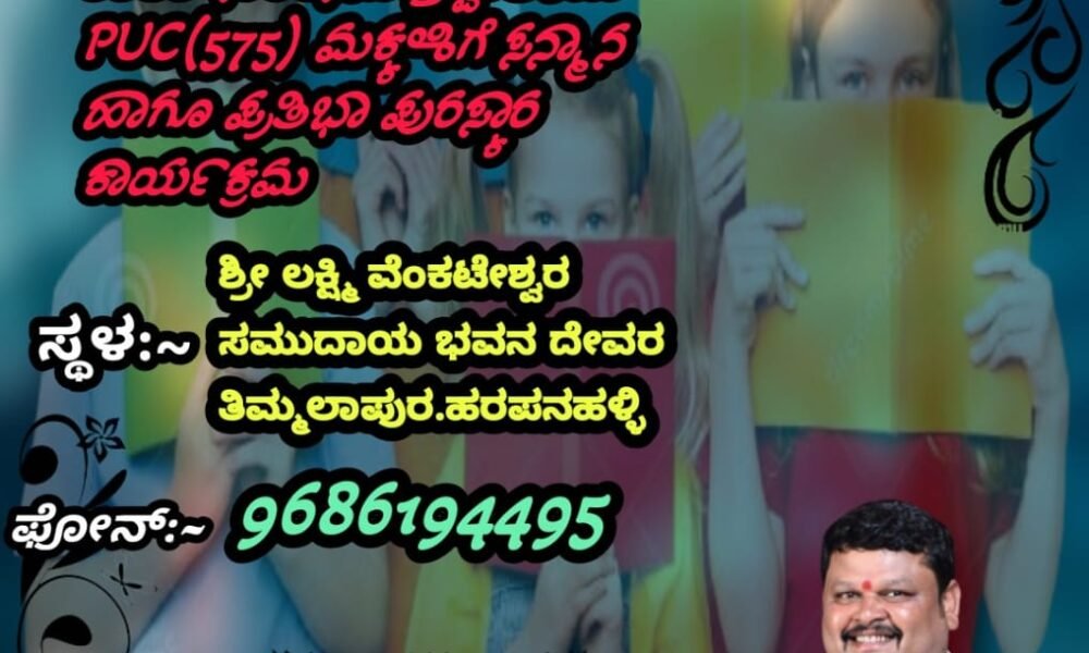 ಪ್ರತಿಭಾನ್ವಿತ ವಿದ್ಯಾರ್ಥಿಗಳಿಗೆ ಪುರಸ್ಕಾರವನ್ನು ಇಂದು ಬೆಳಿಗ್ಗೆ 10.30 ಗಂಟೆಗೆ ಹರಪನಹಳ್ಳಿಯ ದೇವರ ತಿಮಲಾಪುರ ಗ್ರಾಮದ ಲಕ್ಷ್ಮೀ ವೆಂಕಟೇಶ್ವರ ಸಮುದಾಯ ಭವನದಲ್ಲಿ ಆಯೋಜಿಸಲಾಗಿದೆ.